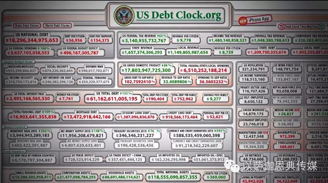 JEFF: 简单从2010年说起,我当时说美元将于未来10年崩溃。对我来讲历史很显然,看看过去的美国政府,现在18万亿(负债)及其持续增长的速度,你可以看见摆在眼前的是什么。当你看得更远时,你知道即使有这个恐怖的18万亿美元负债,它也只是冰山一角,美国还有许多未合理统计的债务和应付项。今日美国的债务与应付项的总额超过了95万亿。平摊到每个人身上就是30万美元/人。若按一家四口的口径计算,则是每户120万美元。我确定你还有2008年的大萧条与经济危机的记忆。非常糟,甚至乔治.索罗斯亦如是说:“我们目睹了2008年的金融系统崩溃,他们已经做的与正在做的,就是印制美元纸币以确保不玩完。” 然而,证据源自数据。2008年美联储宣布启动一个他们从未干过的事儿,就是量化宽松,实际上也就是印制前所未有数量的纸币。于是乎纸币四处飘撒,结果就在证券市场体现出来,市场飙升到历史新高。然而,这样的货币印制游戏不得不在某时停止,世界其他国家也知道这事成必然。作为回应,世界各国开始远离美刀。中国启动了自己的银行兑换系统,也就是第一个世界性支付系统,以对抗美元基石的货币系统。世界性的脱离美元的运动正在进行,他们试图逃离2015年9月的崩溃。