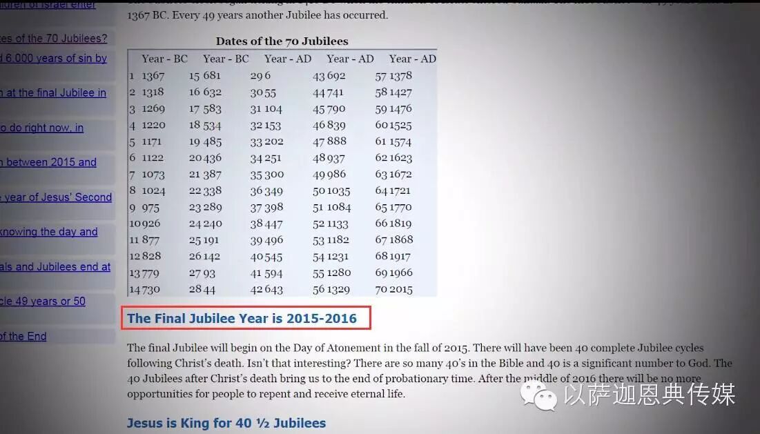 前面我没有提及这个概念,每七个安息年,或每七个七年周期,也就是每49年之后的一年,叫做禧年。每50年一次。禧年,对于犹太人来讲,是上帝要归还土地,这些土地曾被上帝从犹太人祖先的手里没收。 注意1967年是一个禧年,以色列赢得了七日战争,以色列战胜约旦、获得约旦河西岸,战胜埃及获得加萨走廊与西奈半岛,战胜叙利亚获得戈兰高地。继续往前追溯,再上一次禧年是1918年,大英帝国从土耳其奥特曼帝国手中夺回耶路撒冷。因此,在前面两次禧年里,以色列土地归回均有进展。