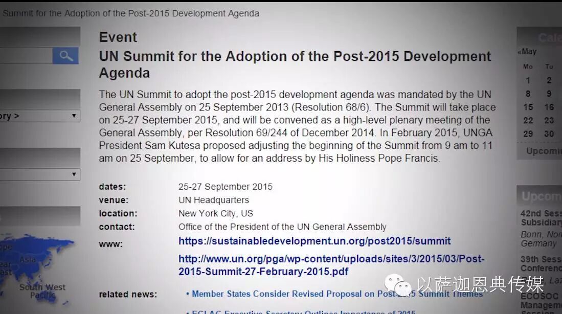 下一次禧年开始于今年9月14日。也是在9月,联合国计划启动一个统筹全世界的计划,称为“可持续发展峰会”,会期在9月25-27日。地球上最著名的人士将在峰会演讲,包括罗马教宗方济各。这个计划的核心是拓展全球政府。全球政府也可以被定义为单一世界政府,或新世界秩序。 有趣的是,整个九月份教宗在美国事务繁忙,9月15日教宗在联合国讲话,24日在美国国会讲话。