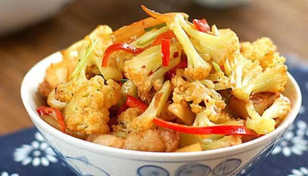 3、倒入洗净沥干的菜花煸炒(菜花一定要充分沥干,不然就没有干煸的香味了);