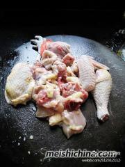 姜去皮切成米粒状,用油爆香后,铲起备用。用余油把鸡块炒到金黄。