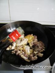 加入1小匙砂糖,翻炒均匀。加入客家娘酒。