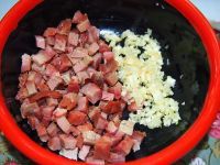 3.叉烧切成小粒,蒜剁成碎蓉备用