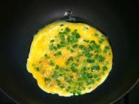 4.把锅烧热下油,倒入香葱鸡蛋液炒散(或煎)成凝固的鸡蛋块