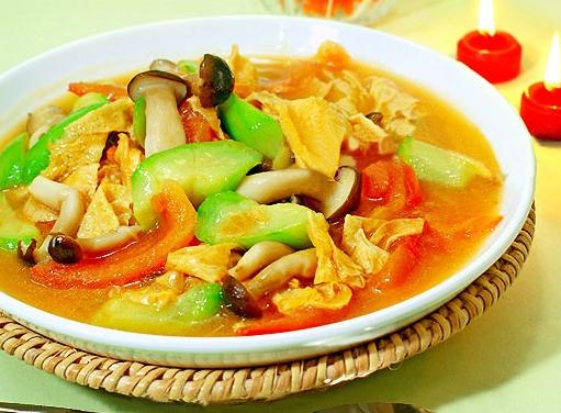 原料:蕃茄、豆皮、丝瓜、蟹味菇