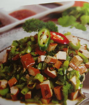 3.把青,红辣椒洗净切细段,与豆干丁,芥菜丁拌匀即可食用。