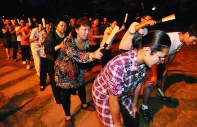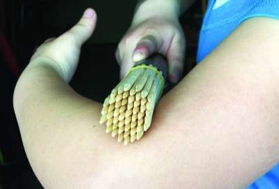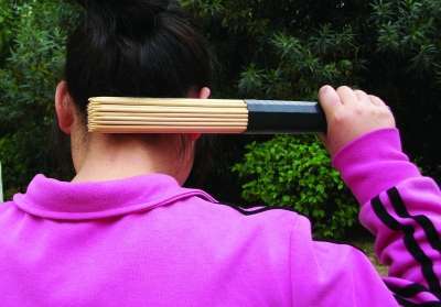 棒击操多打阳经少打阴经,它的特点是一棒透两经,一棒透两穴,就是说当我们打阳经穴位的时候,要透到阴经穴位上去,比如,打合谷透后溪,打曲池透少海,打肩髃透极泉,要达到透的作用,那一个是对棒子有要求,再一个是对打法有要求。首先棒子要有弹性,便于传播敲击力度,如果是实心的棍子,人容易受伤,而且打的时候不能打的弹起来,要压打,也就是说打的时候要压下去。至于打击的力量,要由轻到重,以自己能承受为宜。