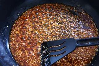 8、慢慢的糖醋汁的颜色就会变红,这时倒入熟芝麻和淋入白醋继续搅拌。