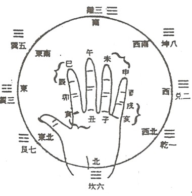 随便说一个时间,2018年3月10日早8点:左手,拇指掐“子”上后退3个两位(3为8,9,10三个)为“午”。接着从“午”上顺掐5位(5为甲、乙、丙、丁、戊5位),得“戌”位即“戊戌”干支。此年柱。