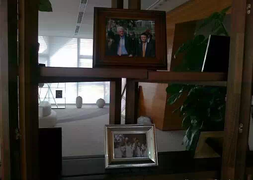 书架,兼具有屏风功能,上面摆了不少相框,马云说过,他见过世界上许多成功的企业,发现在那些成功的CEO的办公室里,办公桌前总是挂着自己最喜欢的人的照片,椅子后也都是挂着企业团队,个人朋友等支持、帮助过自己的人的照片。这些企业家的成功,是因为他们面对微笑,天天开心;因为他们拥有企业成长的最稳固的靠山。相反,那些失败的企业,整个屋子里都充满铜臭味。马云认为,当一个企业领导人满脑子都是美元、人民币的时候,他说话时肯定满嘴是港元,那他的企业就不会走得远。