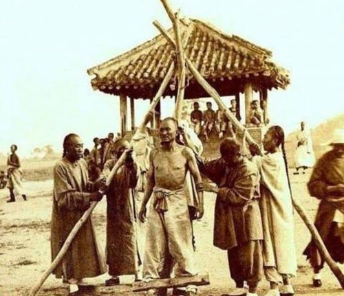 图:清末老照片。犯人后面的亭子里,看热闹的已经悠闲地坐好
