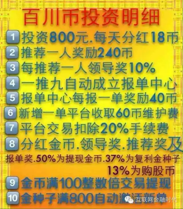 百川理财币闭环模式系统是一个神奇的系统,全球首创模式!投资800元每天分红最高18元,50%现金币,13%消费币,37%自动进入循环子账户,让您在5—7年时间内实现财务自由!长线静态,平安理财就选百川理财币!