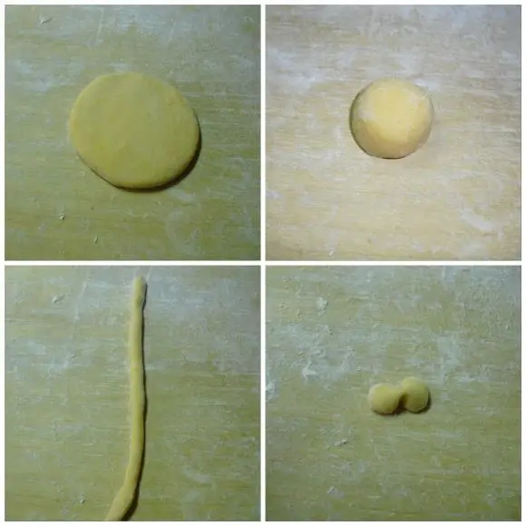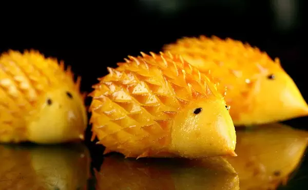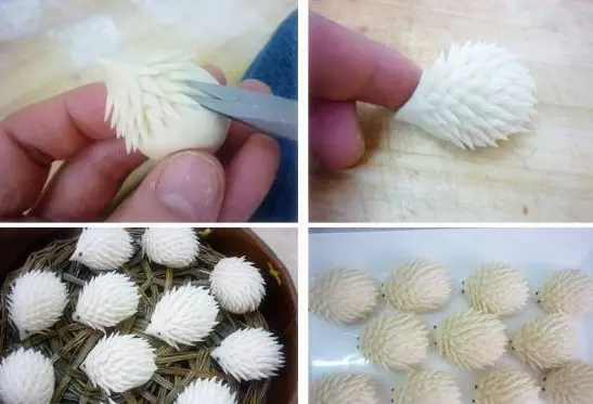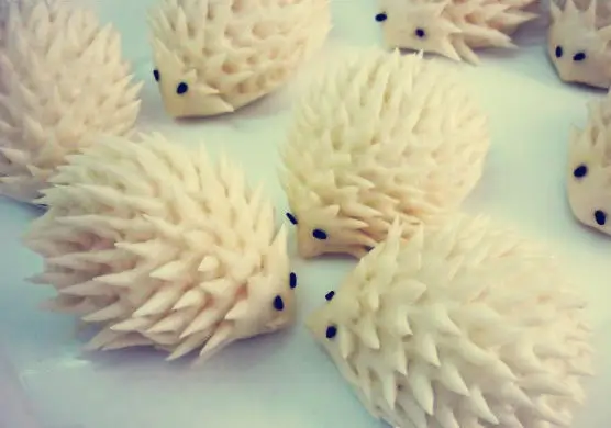 所有原料放在一起揉成面团。醒发半小时,搓条下成小剂子,包入花生馅,搓成象刺猬一头尖的形状。