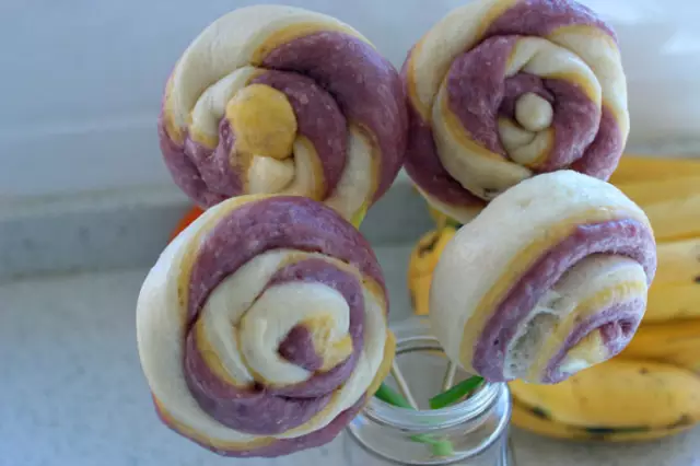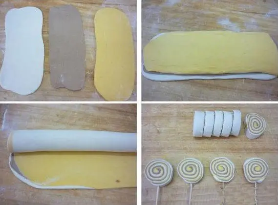 面粉分三份和胡萝卜泥,豆沙,水和成三色面团,醒发半小时,分别擀开成大小差不多的薄饼,叠加在一起,从一边卷起成筒状。切开插入竹棒,醒发一会,入蒸笼蒸熟,就成了棒棒糖状的花卷了。