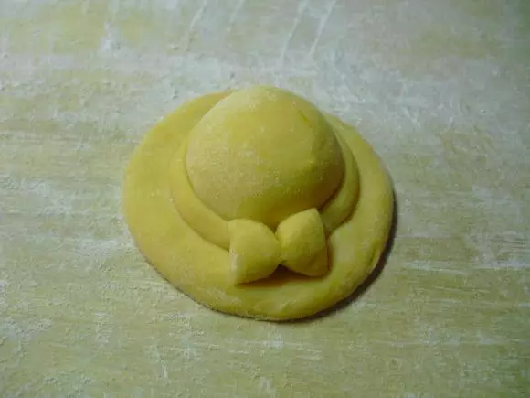 6.一小块面压扁用筷子夹出蝴蝶结形状,压在面条的连接处。