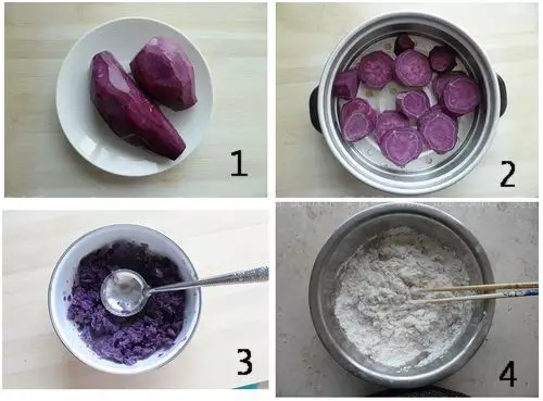 面粉300g,紫薯2个,牛奶130g,白糖70g,奶粉10g,酵母4g