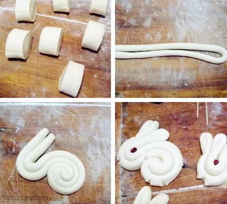 1.面粉中加入酵母、白糖和温水和成面团,饧15分钟。分割成每个50克的剂子。