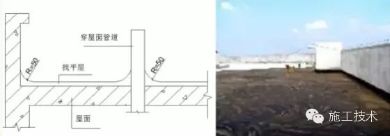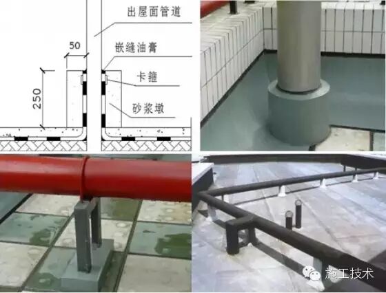 22 出屋面水管及支架 管道根部按照防水要求做法八字角和附加层,卷材卷起至少250mm,上端用卡箍固定。砂浆墩与管道之间填塞柔性防水嵌缝油膏。砂浆墩外侧可根据设计要求的颜色和材质涂刷防水型外墙涂料。伸出屋面管道、支架根部的找平层应做成圆锥台,管道根部500mm范围内,找平层应抹出高度不小于30mm的圆台;管道与找平层间应留20mm×20mm的凹槽,并嵌填密封材料;管道根部四周增设防水附加层,宽度和高度均不小于300mm,该部位防水层收头处用金属箍(或镀锌钢丝)拧紧,并用密封材料封严;保护墩应盖住防水收头,与屋面面层之间留置分格缝。