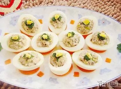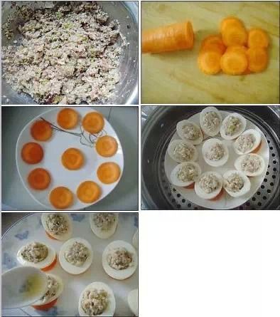 12.将调好的馅料填入蛋白,然后将填好馅的蛋白放到胡萝卜片上。蒸锅中放适量水,用大火烧开,将装好盘的鸡蛋上屉蒸约10分钟13.上桌前换大盘,在馅料上淋入蒸鸡蛋时留出的汁,再加香菜与些许蛋黄点缀即可
