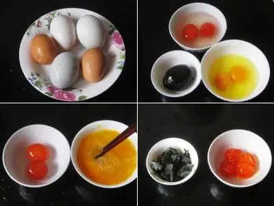 主料:咸鸭蛋2个、鸡蛋2个、皮蛋1个辅料:油适量、料酒适量、清水适量
