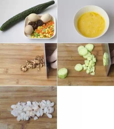 主料:剩饭500g、青瓜20g、鸡蛋50g、杂蔬100g、香菇10g、虾仁20g辅料:油适量、盐适量