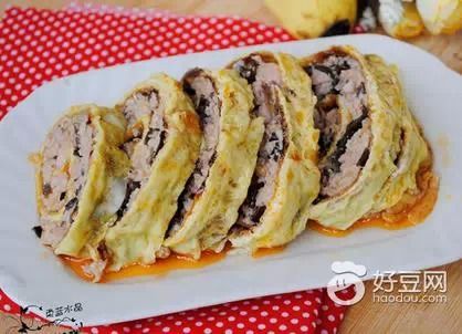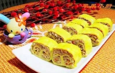 7.将拌好的馅,均匀的平铺在蛋皮上面。