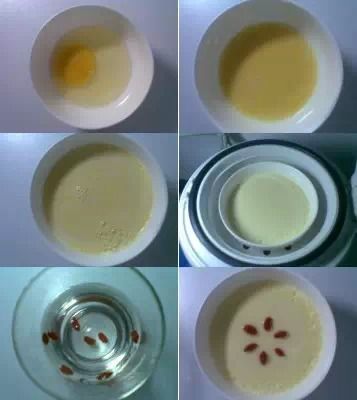 主料:牛奶100ml、鸡蛋1个辅料:白糖适量、枸杞6g