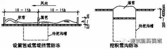 大面积的土方工程可在地面上设篱笆或雪堤,高度一般为0.5-1m;基槽、基坑土方工程可在基槽、基坑位置的地面上挖积雪沟,将雪填满,防止未挖掘的土层冻结。适用于降雪量较大的地区。