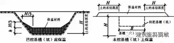 适用于防止已开挖基槽、基坑基土受冻的方法。一种是在基槽、基坑上面铺设木楞、木板和15-20mm的保温材料;另一种是在基槽、基坑底面铺设珍珠岩袋、稻草、炉渣等保温材料,然后搭设塑料大棚。