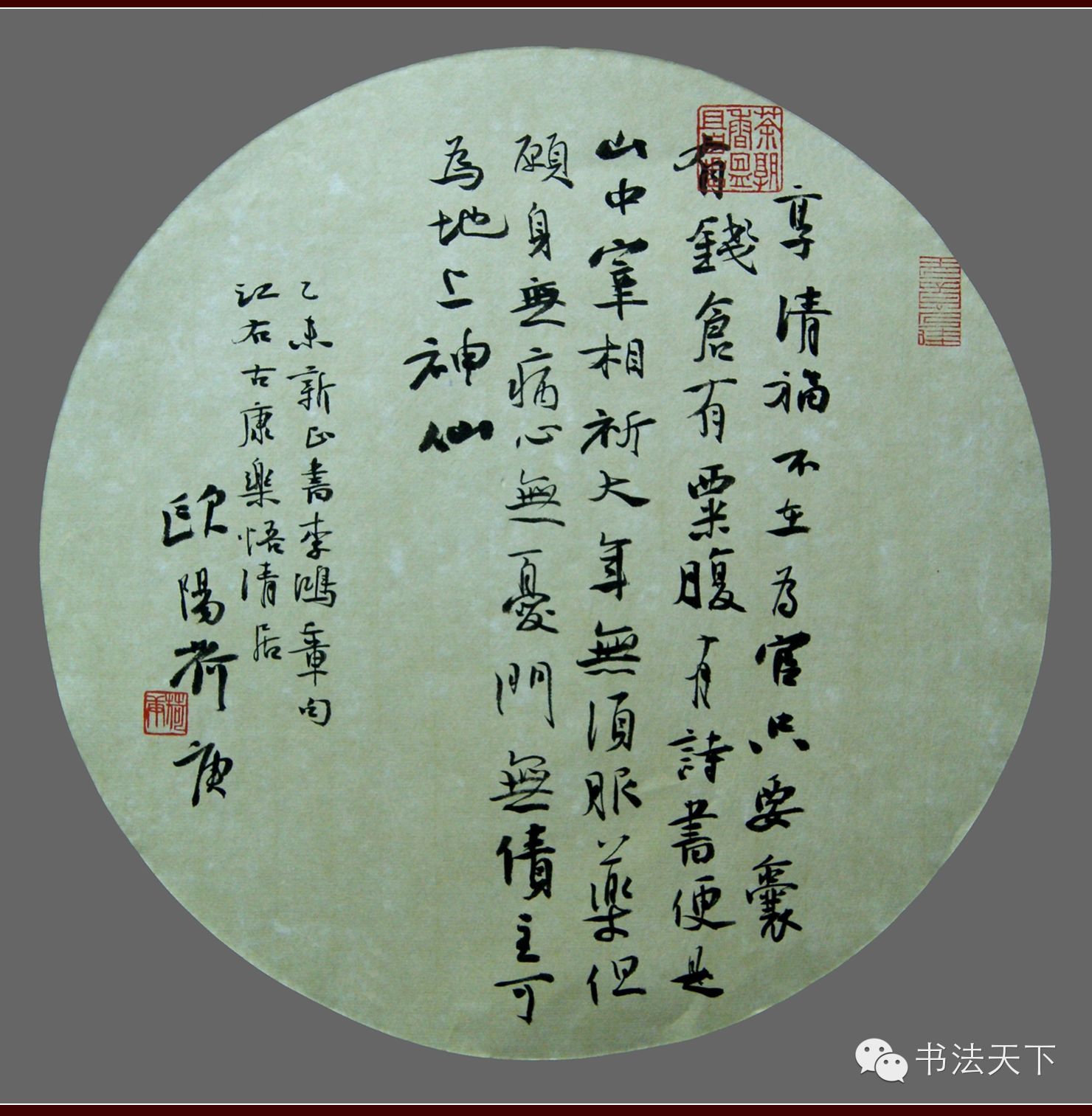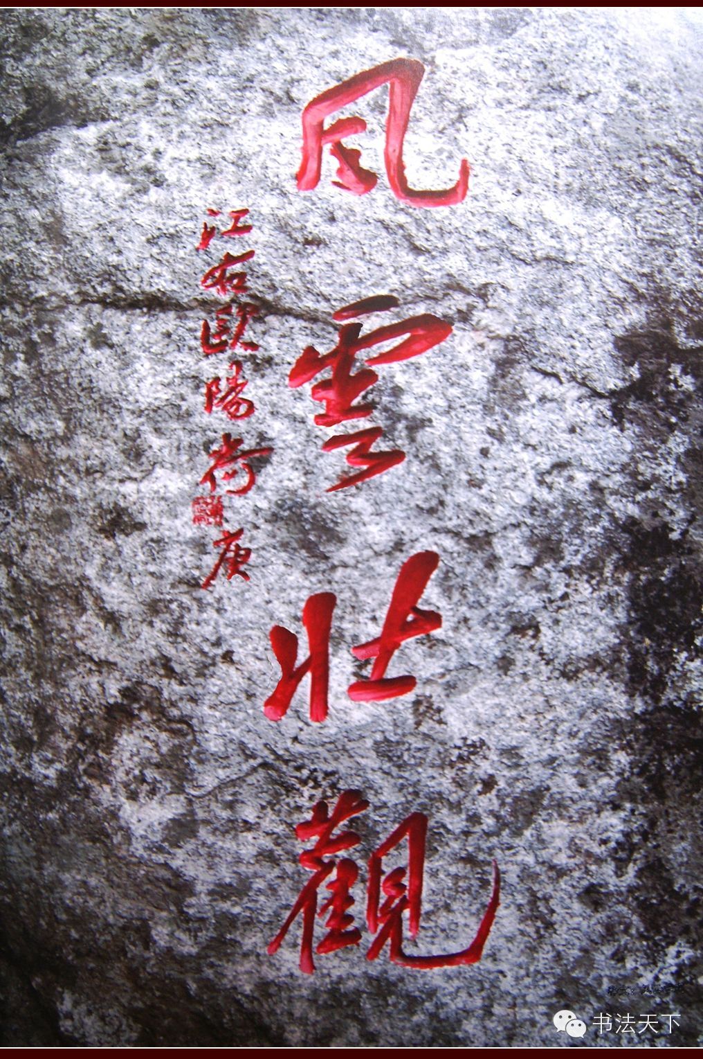 东坡有诗云:诗不求工字不奇,天真烂漫是吾师。所谓“天真烂漫”四字,当为合乎自然,得鱼忘筌之真理也。古人作书,力求字外功夫,能于笔墨之外,窥得些些趣味,方是书家得意之妙。及见欧阳兄作书,点画精到,气韵生动。舒展如意,收放自然。无不于随手挥洒间,见清奇古雅之韵致也。故其书,或宛转跳跃如沉鳞竟起;或圆浑劲健似浪遏飞舟;或沉郁顿挫若狮子扑象;或舒卷流动同长瀑飞泉。是以坡翁之蕴藉,右军之俊逸,老米之酣畅,融汇参合之变化,取精用弘之智慧,成就此天真烂漫之格调也。