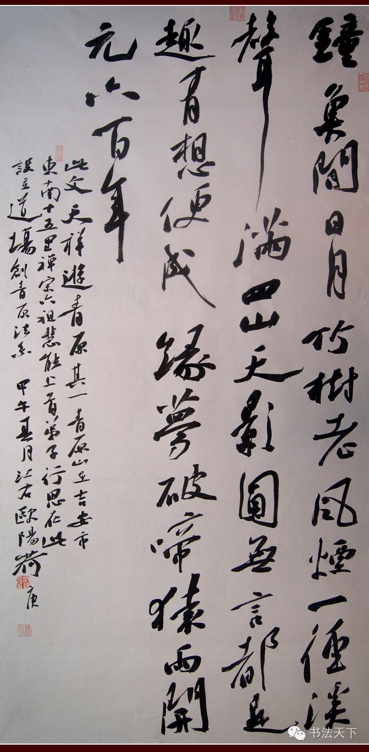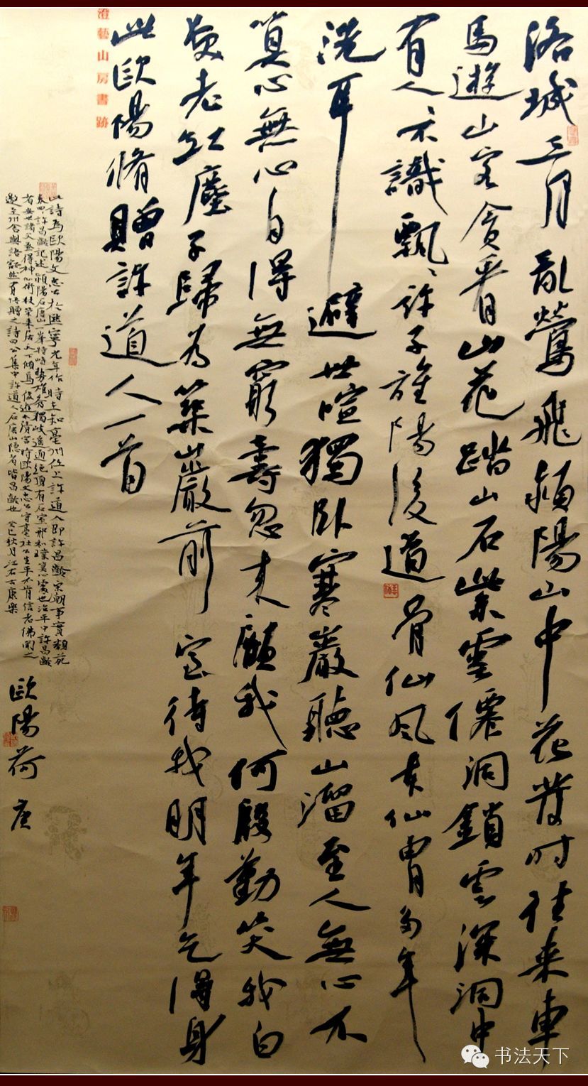欧阳荷庚之书法与其他人颇有不同,不同之处就在于其书在格调和气象上煞是感人,不仅富有浓郁的文人气,还具有山林气,绝非泛泛之辈可比。好的书法作品,绝不仅仅在于技术有多好,是否写像了古人,而在于个人性情是否得到了真实的体现,是否写出了一种境界和气象。观欧阳荷庚的书法作品,使人瞬间感受到一种历史的穿越感,可以上溯到北宋甚至晋唐那个文人墨客吟风啸竹的特殊年代。