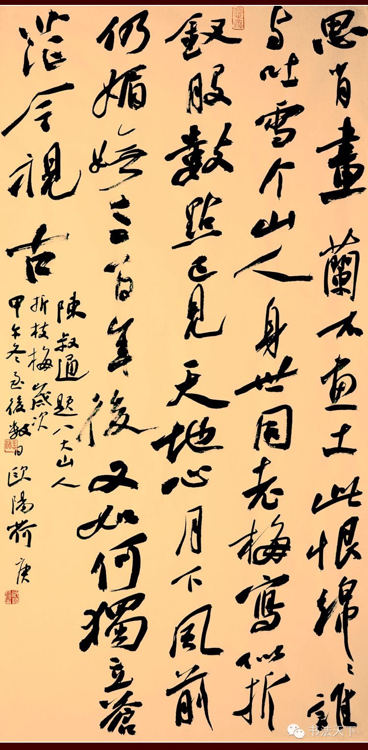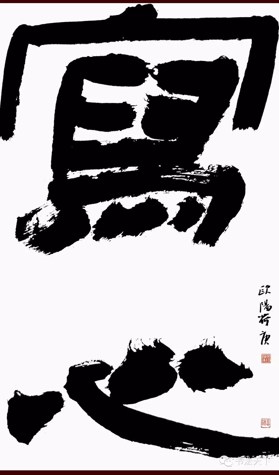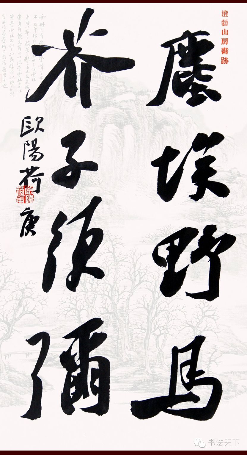 欧阳荷庚小楷、隶书皆能,但目前而言,行书才是他具有个人面目的符号。他的行书主要取法苏东坡粗犷豪放的《寒食帖》一路。整体气势磅礴,有一泻千里之动感;在章法上习惯于大篇幅,不加装饰拼接,字的大小错落有致,字与字欹侧相生,行与行顾盼多姿;结字笔画夸张,纵横如长枪大戟,看似“不拘小节”,然则粗犷中有细腻,有些“小动作”加入其中,自然丰富了技法、提高了难度。