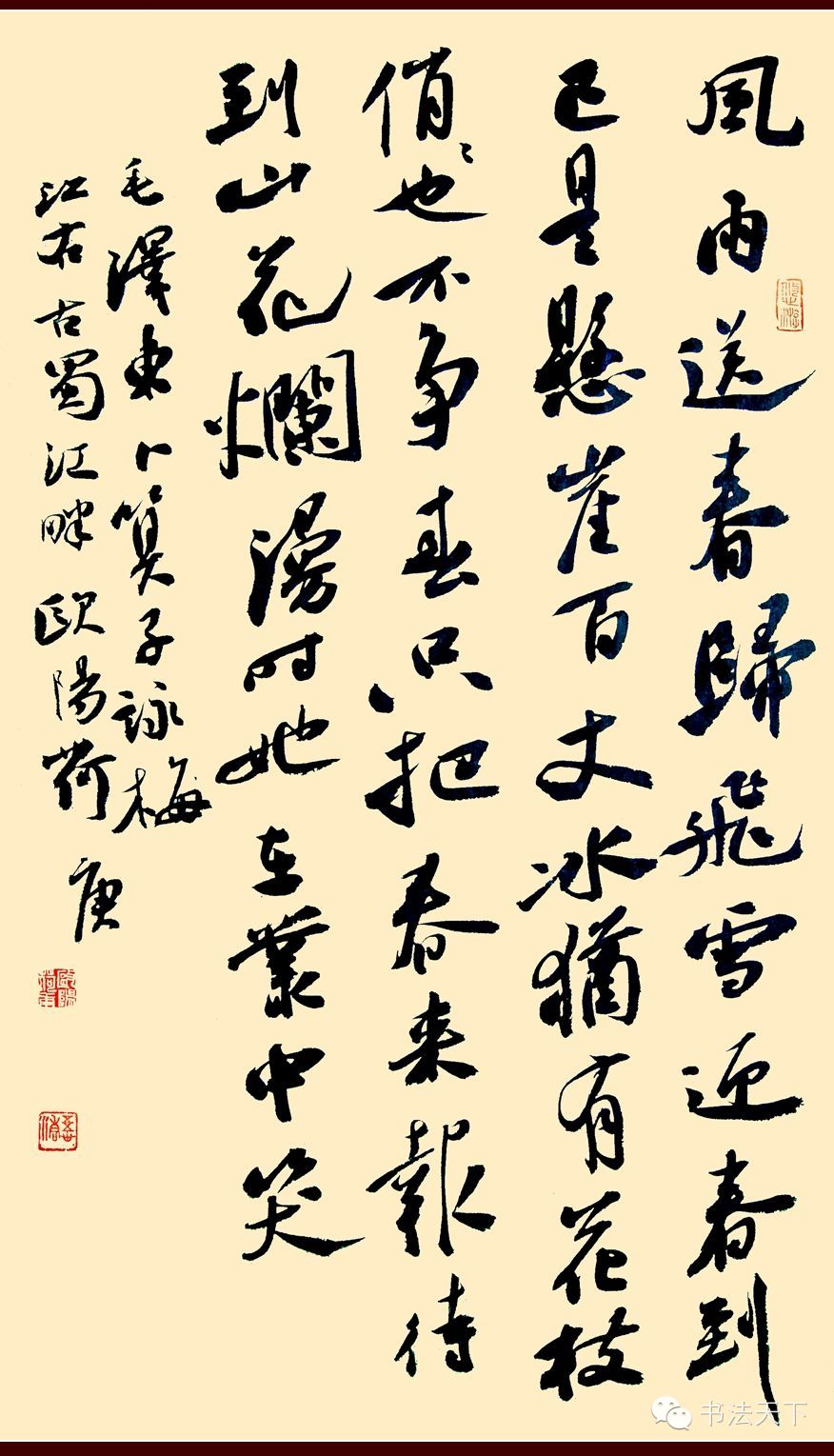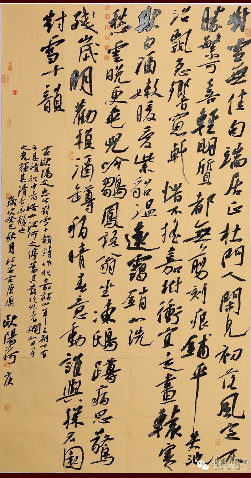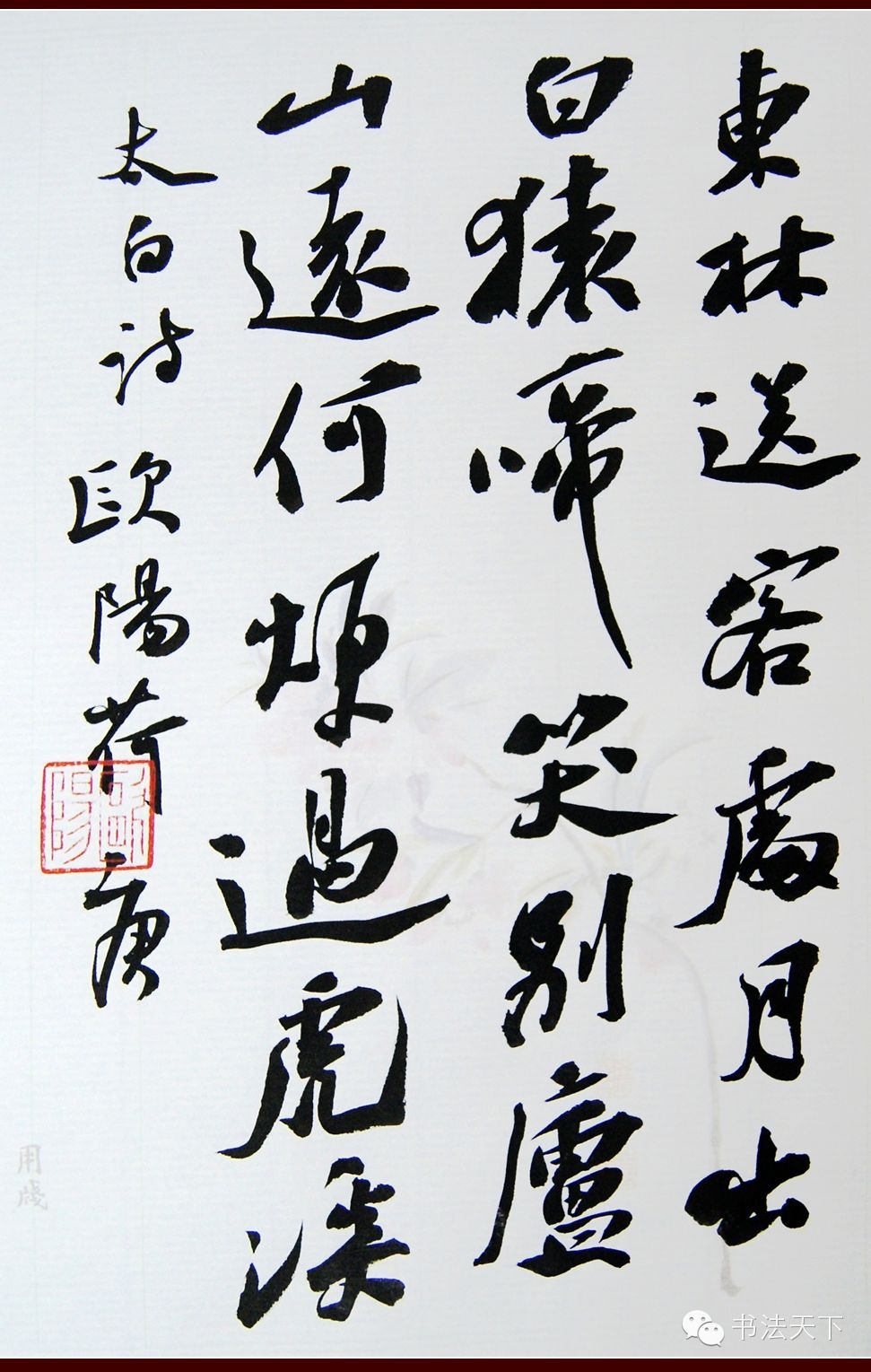欧阳荷庚小楷、隶书皆能,但目前而言,行书才是他具有个人面目的符号。他的行书主要取法苏东坡粗犷豪放的《寒食帖》一路。整体气势磅礴,有一泻千里之动感;在章法上习惯于大篇幅,不加装饰拼接,字的大小错落有致,字与字欹侧相生,行与行顾盼多姿;结字笔画夸张,纵横如长枪大戟,看似“不拘小节”,然则粗犷中有细腻,有些“小动作”加入其中,自然丰富了技法、提高了难度。