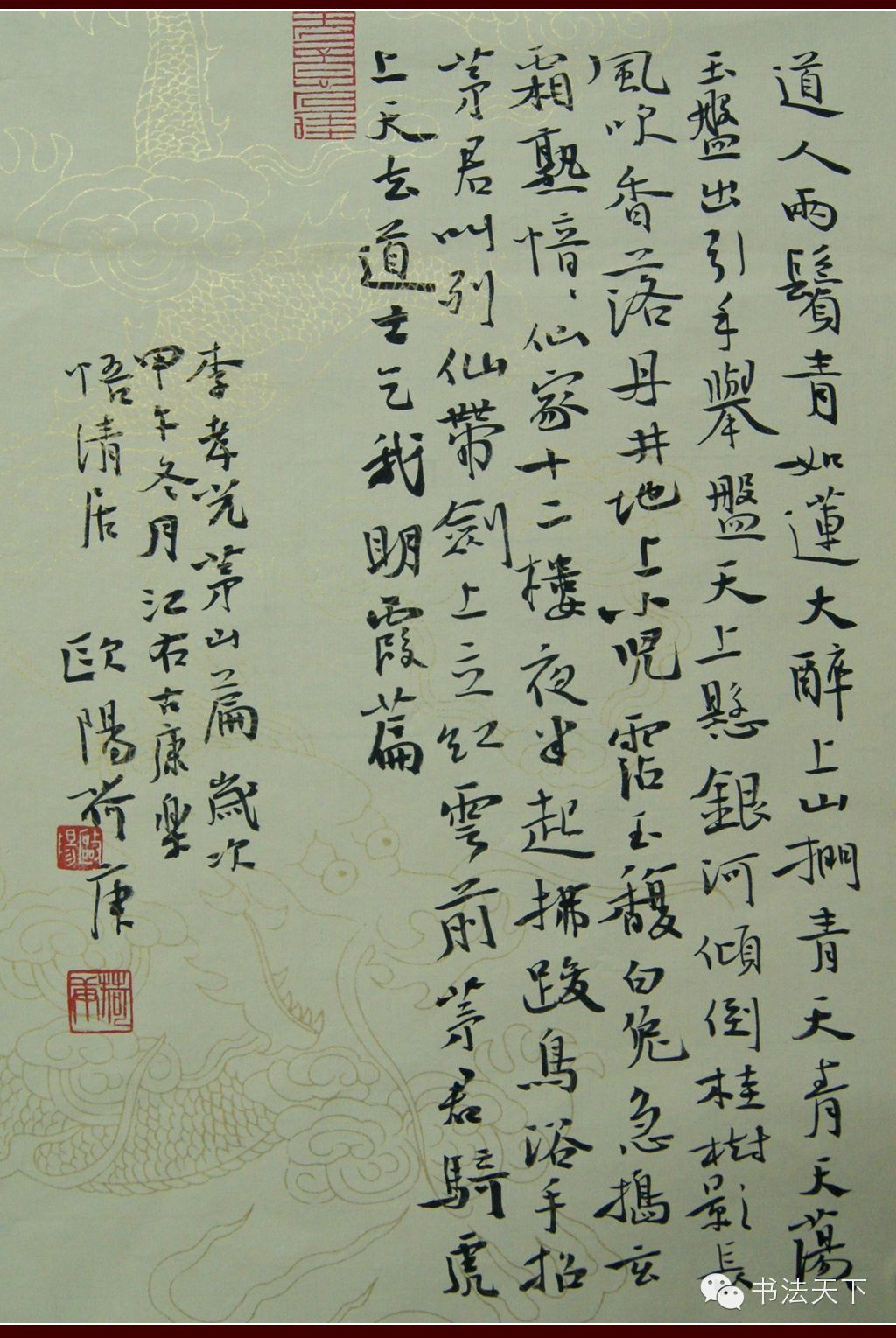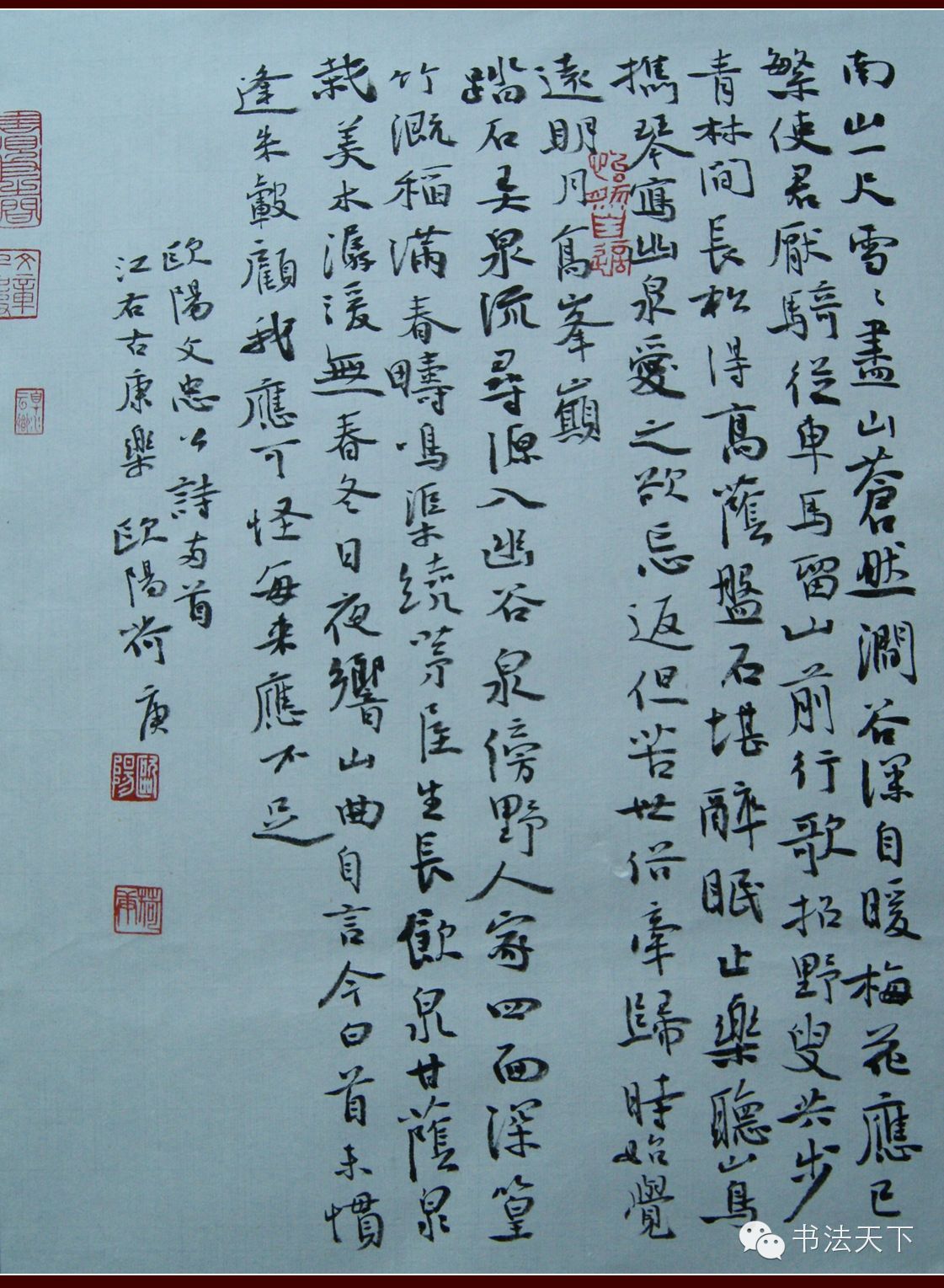 依我看来,欧阳荷庚所擅长者,首推行书,其次是小行楷,再次是隶书。其近年行书脱胎于苏东坡,也有黄山谷行书的影子。有的作品还或多或少有颜真卿和杨凝式行草书的韵味。
