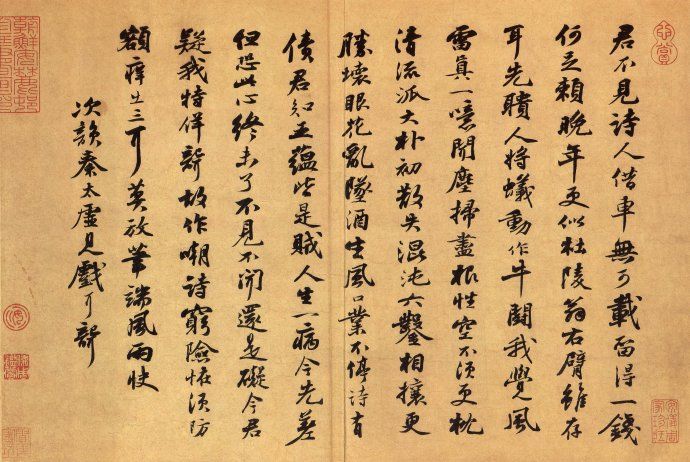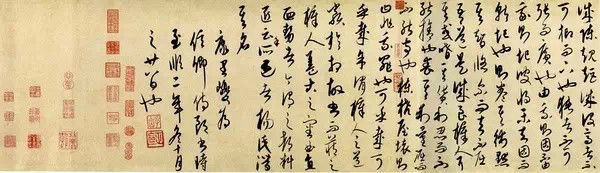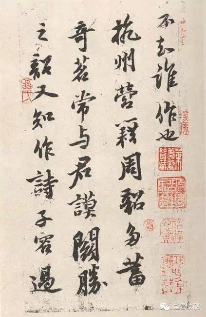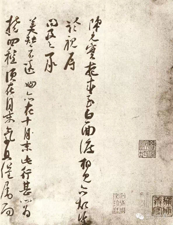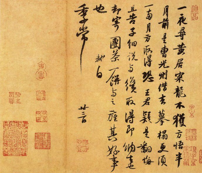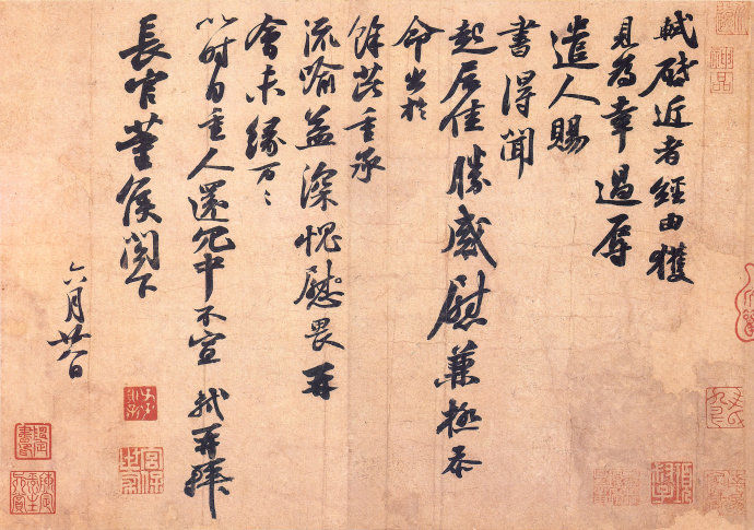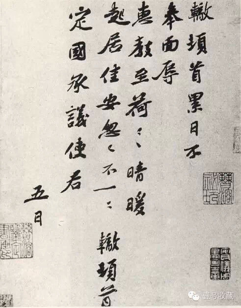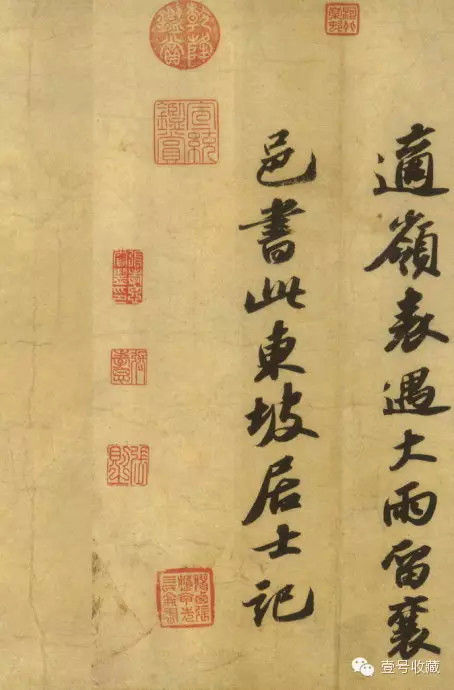 此帖曾经明项元汴,清安岐等递藏,后入清内府。安岐将此帖与《岁新展庆帖》合成一帖,并称坡公杰作。《人来得书帖》凝重,笔法流畅,为书牍杰作。