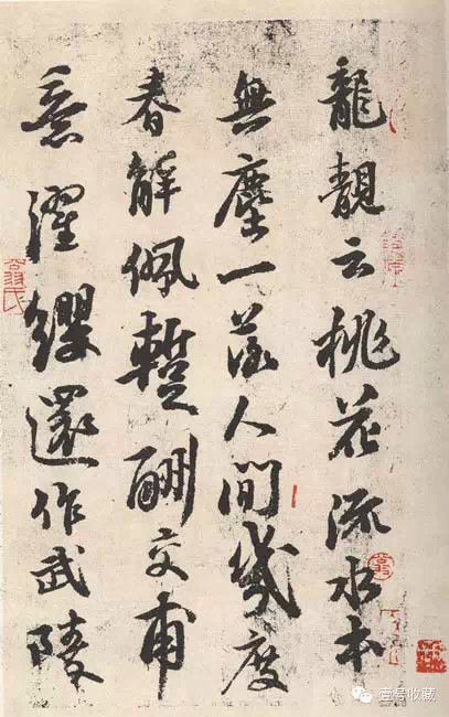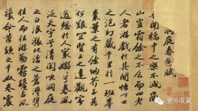 洞庭春色赋,苏轼撰并书。前者行书三十二行,二百八十七字。真迹清初为安岐所藏,后入清内府,刻入《三希堂法帖》。后来又散人民间。1982年由吉林省博物馆收藏。此为苏轼晚年所作,自题云:“绍圣元年(1094)闰四月廿一日将适岭表,遇大雨,留襄邑,书此。”时年已五十九岁,笔墨更为老健,结字极紧,意态闲雅,奇正得宜,豪宕中寓妍秀。乾隆曾评:“精气盘郁豪楮间,首尾丽富,信东坡书中所不多觏。”《佩文斋书画谱》卷七十七赞誉为“当是眉山最上乘”。由此帖可见苏武的又一种行书风格。