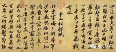 天际乌云帖又称《嵩阳帖》,共三十六行,计三百零七个字。此帖无年款,据清翁方纲所考,约在熙宁十年(一O七七)至元祐丁卯(一O八九)这十余年中所书,时苏东坡四十二至五十二岁间。应该说,这是苏氏书法艺术比较成熟时期的作品。
