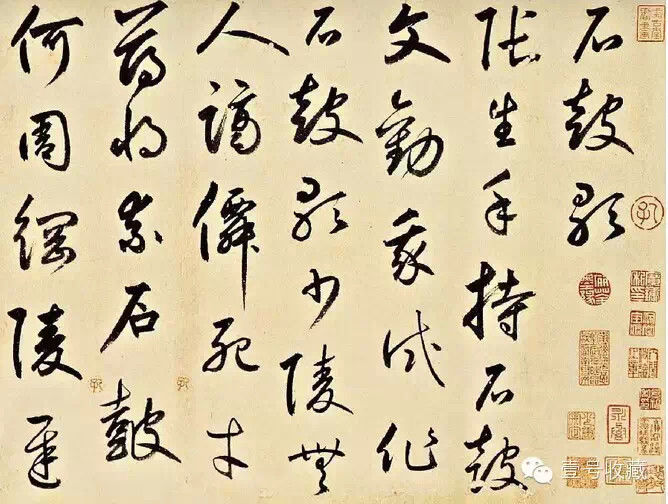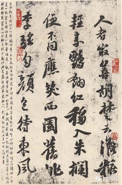 米芾则说王安石的书法学的是五代时的杨凝式,而且颇为自负地说很少有人知道这一点。张邦基在《墨庄漫录》中更另有一番见解,他说王安石的书法清劲峭拔,飘飘不凡,世人称之为横风疾雨,