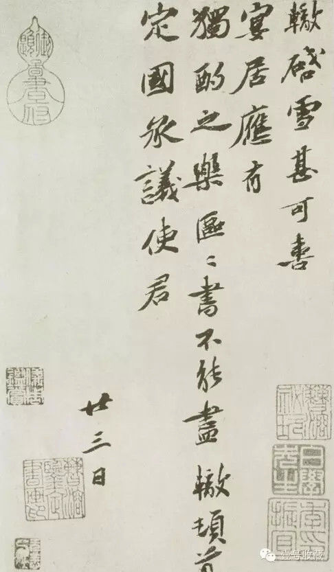 苏辙致定国承议使君尺牍《宴居帖》 行书 释文: 辙启 雪甚可喜 宴居应有独酌之乐 区区书不能尽 辙顿首 定国承议使君 廿三日
