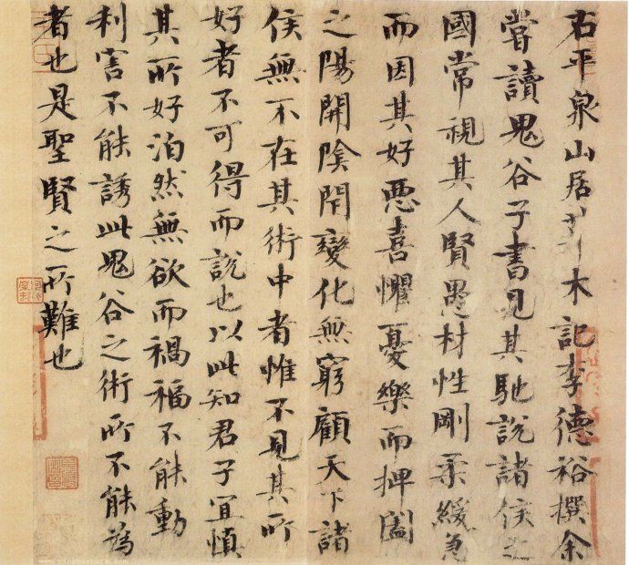 可抑而下也,狭者不可张而广也。由我则固,不由我则圮。彼将乐去固而就圮也,则卷其术,默其智,悠尔而去。不屈吾道,是诚良梓人耳! 其四,根据记载柳宗元的姐姐擅长隶书,而柳宗元的童年是在长安家中母亲姐姐的身边度过的。因此从家庭影响看.柳宗元应该会受到家庭的影响而学习隶书。又据王蘧常《沈寐叟先师书法论提要》云:“《杂家言》云:‘橘逸势传笔法于柳宗元,唐人呼为橘秀才。”’日本延历二十三年七月,空海与最澄以及留学生橘逸势奉敕渡海赴唐八月从福州长溪县登陆,十二月到达长安。而804年柳宗元也正好在长安.橘逸势向柳宗元学习请教书法应该是可信的。对橘逸势书法的评价,据《文德实录》载:“犹妙隶书,宫门榜题,手迹见在。”既然橘逸势的老师是柳宗元,橘逸势又擅长隶书,柳宗元擅长隶书就不足为怪了。