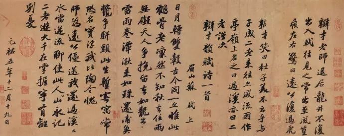 《洞庭春色赋》与《中山松醪赋》,均为苏轼撰并书,此两赋并後记,为白麻纸七纸接装,纸精墨佳,气色如新,纵28.3厘米,横306.3厘米,前者行书三十二行,二百八十七字;后者行书三十五行,三百十二字;又有自题十行,八十五字,前後总计六百八十四字,为所见其传世墨迹中字数最多者。前者作於公元1091年冬,後者作於公元1093年,为苏轼晚年所作,苏轼贬往岭南,在途中遇大雨留阻襄邑(今河南睢县)书此二赋述怀。自题云:“绍圣元年(1094)闰四月廿一日将适岭表,遇大雨,留襄邑,书此。”时年已五十九岁。