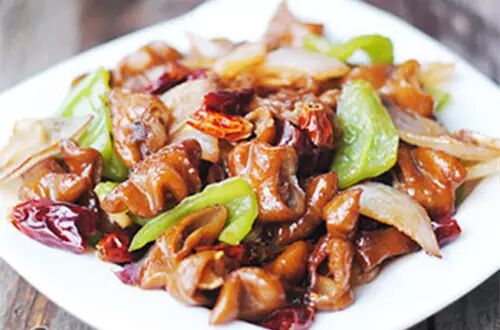 6、放入肥肠和青椒翻炒,最后加1茶匙盐调味即可。