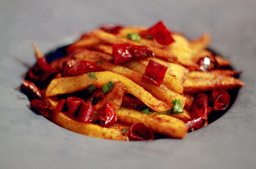 8、倒入土豆条煸炒一会儿,最后调入花椒粉、辣椒粉、孜然粉,拌匀即可。