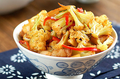 3、倒入洗净沥干的菜花煸炒(菜花一定要充分沥干,不然就没有干煸的香味了);
