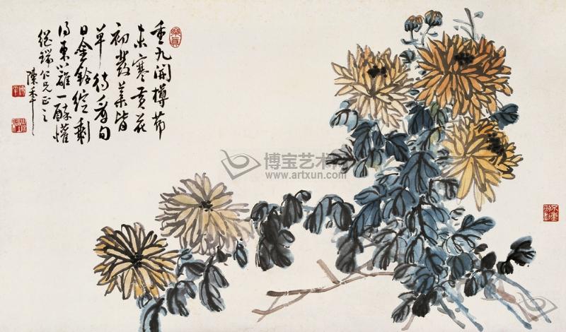 陈半丁(1876-1970年),因为孪生子,故戏号半丁原名陈年,浙江山阴(今绍兴)人,画家。 半丁,即陈年,画家。浙江山阴(今绍兴)人。字半丁(有《陈半丁画册》),一字半痴,别署辟痴,又字静山。以字半丁行世。号半丁老人、半叟、半翁、半野老、山阴半叟、稽山半老、山阴道上人、不须翁、老复丁、竹环、竹环斋主人、鉴湖钓徒、蓬莱山民、藐世头陀。室名一根草堂、五亩之园、竹环斋、莫自鸣馆。1876年(清光绪二年)5月14日出生。家境贫寒,自幼学习诗文书画。少年时父母双亡,生活坎坷。为谋生,十四岁就在兰溪一店当学徒。十五岁在转至钱庄学徒中开始接触笔墨,自此一发不可收,自言当时“嗜书画入骨,饥饿犹不顾也”。十九岁时随表叔吴石潜(西泠印社创始人之一)来上海于严小舫之小长庐馆拓印为业。20岁时赴上海,与任伯年、吴昌硕相识,后拜吴昌硕为师。40岁后到北京,初就职于北京图书馆,后任教于北平艺术专科学校。擅花卉、山水、人物、走兽,以写意花卉最知名。除任颐、吴昌硕外,又师法赵之谦、徐渭、陈淳,吸收明清各家画法而独树一帜。作品笔墨苍润朴拙,色彩鲜丽、沉着,形象简练、概括,讲求诗书画印的相互作用。兼善摹印。曾任中国美术家协会理事、北京画院副院长、中国画研究会会长。1970年1月29日卒于北京陈半丁擅长花卉、山水,兼及书法、篆刻。写意花卉师承任伯年、吴昌硕,又师法陈淳、徐渭、石涛、李复堂、赵之谦诸家。书法以行草见长。作品有《卢橘夏熟》、《高枝带雨压雕栏》、《惟有黄花是故人》等。1956年在北京举办个人作品展览。 有《陈半丁画集》、《陈半丁花卉画谱》行世。
