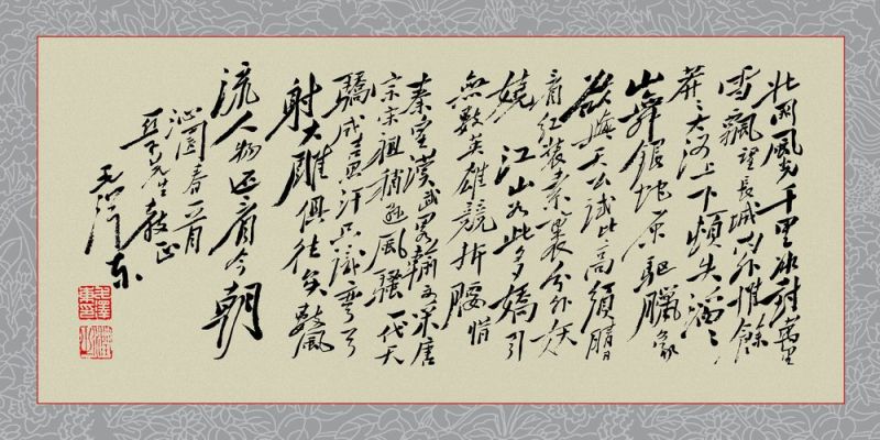 江山如此多娇,引无数英雄竞折腰。惜秦皇汉武,略输文采;唐宗宋祖,稍逊风骚。一代天骄,成吉思汗,只识弯弓射大雕。俱往矣,数风流人物,还看今朝。