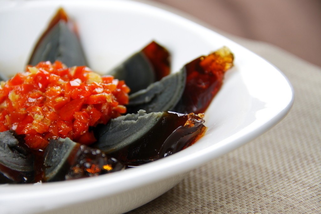 4、切好的皮蛋上剁椒蒜瓣,醋、头抽、麻油、糖、鸡精拌匀调成调味汁倒在皮蛋上即可。