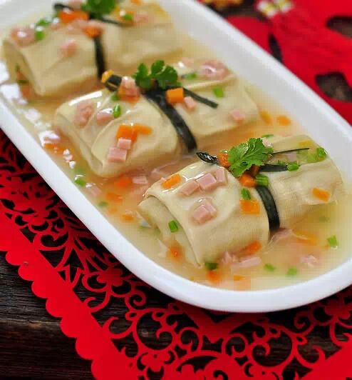 7、把福包装盘,盘子里的鸡汤加少许水淀粉,盐,胡萝卜碎,火腿碎,香菜碎,香油,勾芡浇在上面即可。