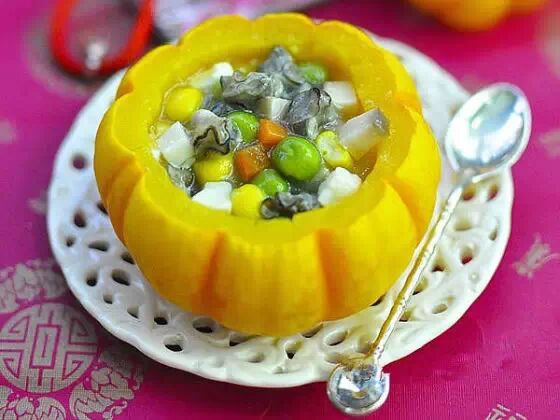 8、将海蛎羹放入蒸熟的金瓜盅内即可。