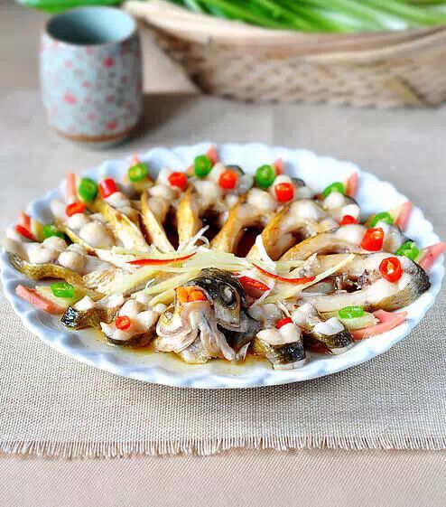 5、开水上锅蒸六分钟,关火后不揭开锅盖焖四分钟。装饰一下即可。 喜欢泼热油的也可以泼。